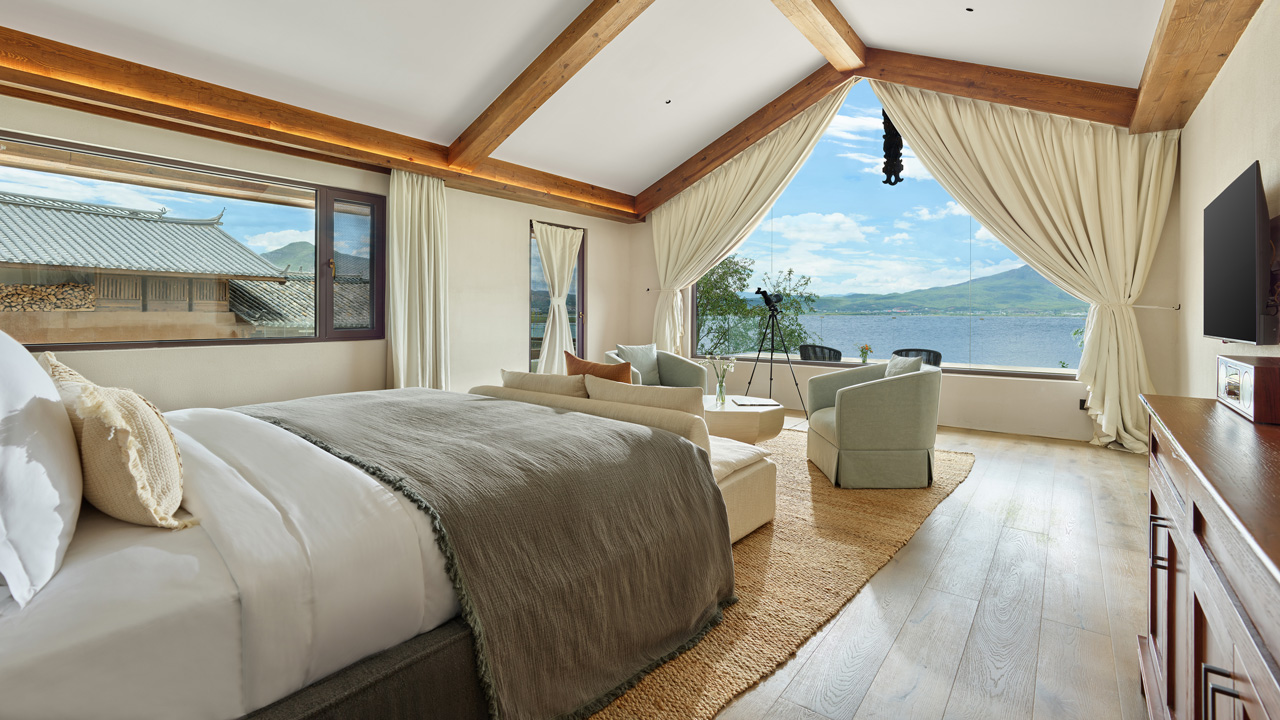 两间精致套房空间宽敞,设计精美,面积达 61-72 平方米。躺在床上即可以欣赏到美丽的湖景。套房还配备室外露台,一个独立浴缸,非常适合在游玩一天后放松身心。