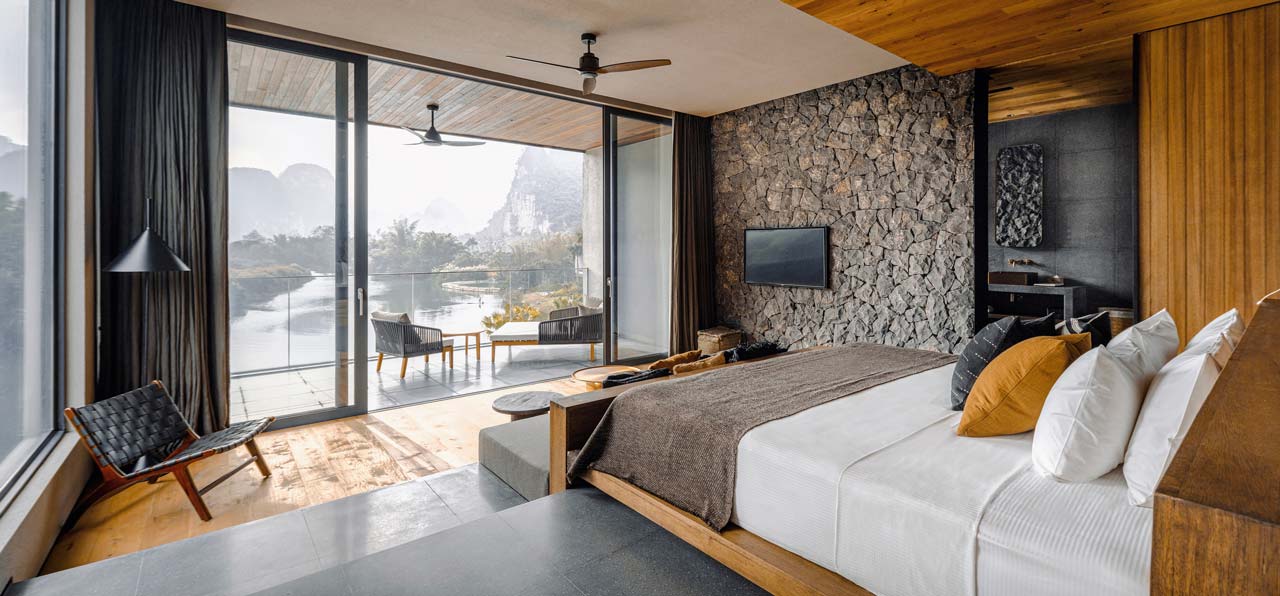每间套房及别墅都体现着“慢旅”及河畔生活的艺术。一切始于喀斯特地貌独特的山、郁郁葱葱的绿林及蜿蜒的河流所组成的如画美景。宽阔的房间及智能家居,房间中多使用未经打磨的原始材料如木、原石及黄铜使得空间更加舒适,仿佛在套房或别墅中就已经近距离的浸入大自然的温暖舒适中。有如教科书般的逸世而居。